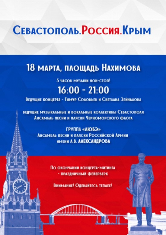 18 марта на площади Нахимова пройдет концерт-митинг, посвященный седьмой годовщине возвращения Севастополя и Крыма в состав России. Об этом сообщают в Правительстве города.