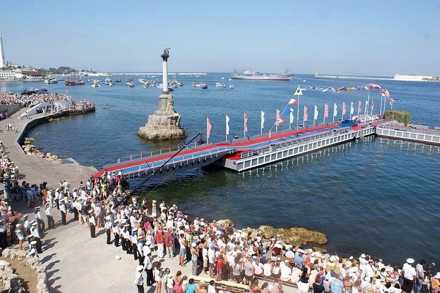 С 9-00 в Севастопольской бухте начинается демонстрация боевых кораблей (парад кораблей и военно-спортивный праздник). Здесь же можно посмотреть на абордаж пиратского судна, спасение экипажа с тонущего корабля, различные представления, подготовленные группами парусных яхт, катеров, буксиров.