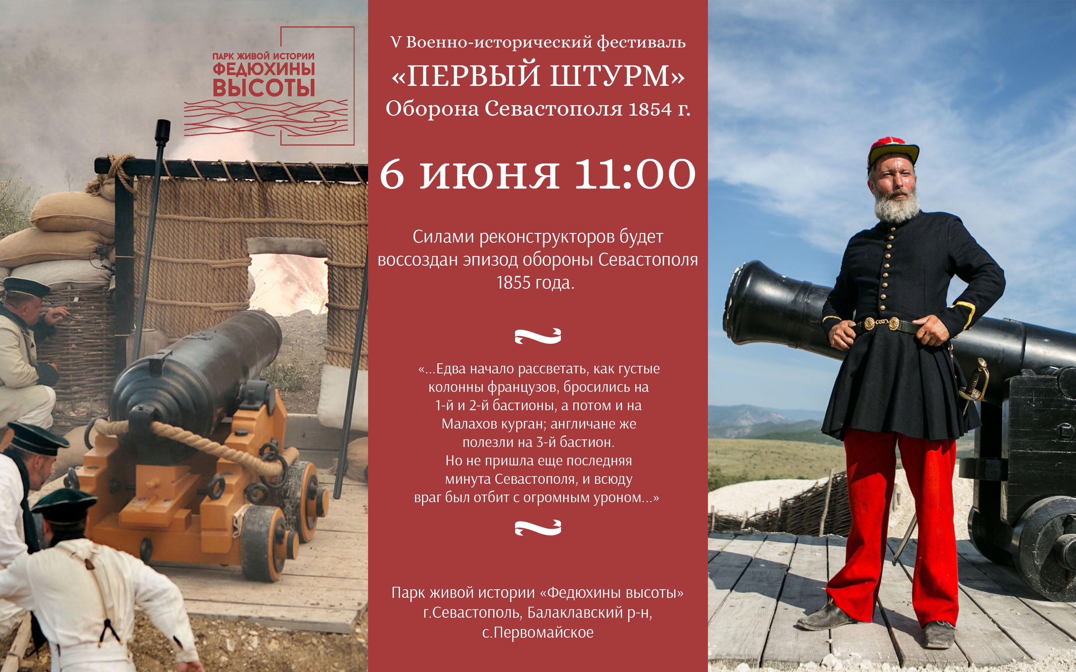Впервые на ежегодном слете реконструкторов периода Крымской войны “Первый штурм 1855” будет проведена театрализованная историческая реконструкция штурма, открытая для зрителей. После “боя” - экскурсии по площадке “Первая оборона Севастополя”, полевая кухня, интерактивные программы.
