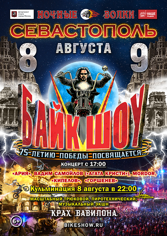 8-9 августа 2020 в Севастополе на площадке у горы Гасфорта пройдет XXV международное байк-шоу мотоклуба "Ночные Волки", кульминация которого названа "Крах Вавилона" и посвящена 75-летию Победы в Великой Отечественной войне.